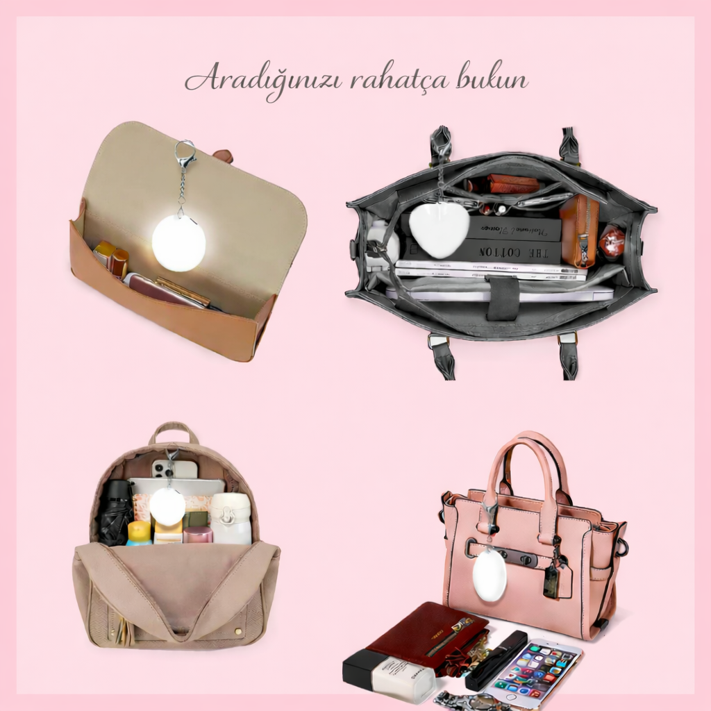 Çantada, anahtarlıkta ya da elde taşınırken küçük bir ışıkla fark edilir,